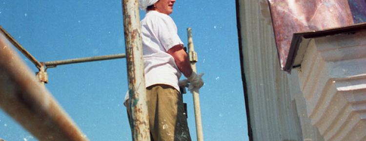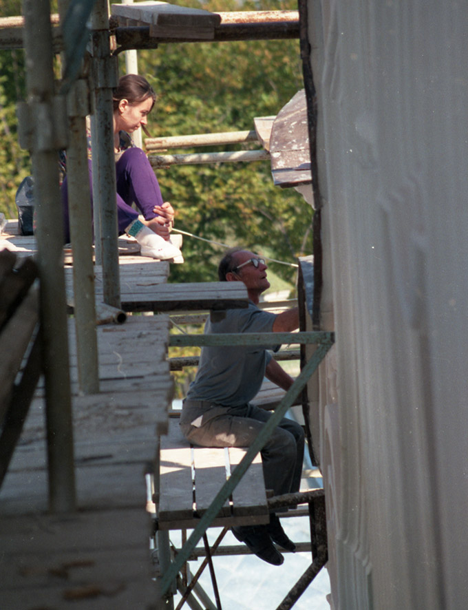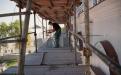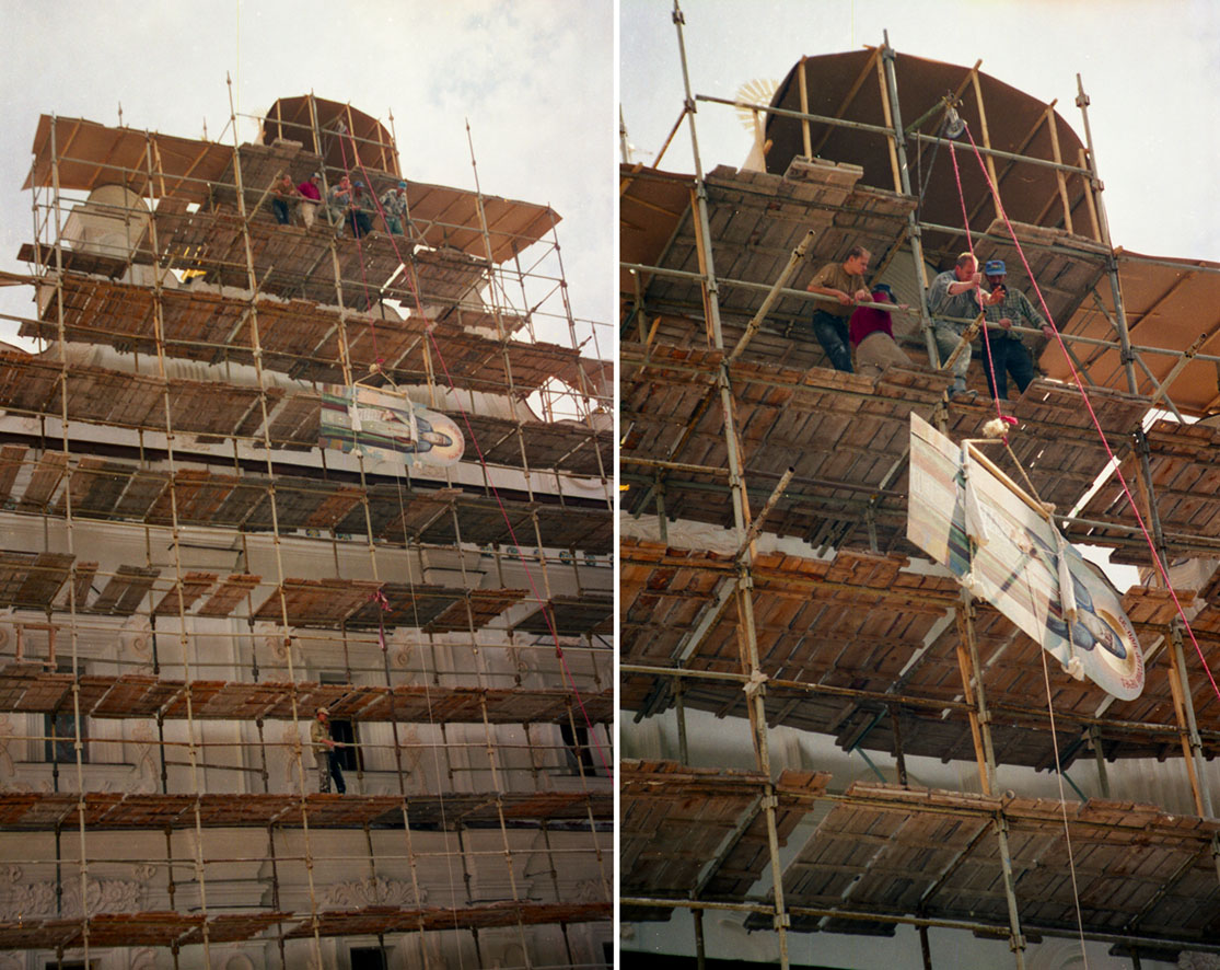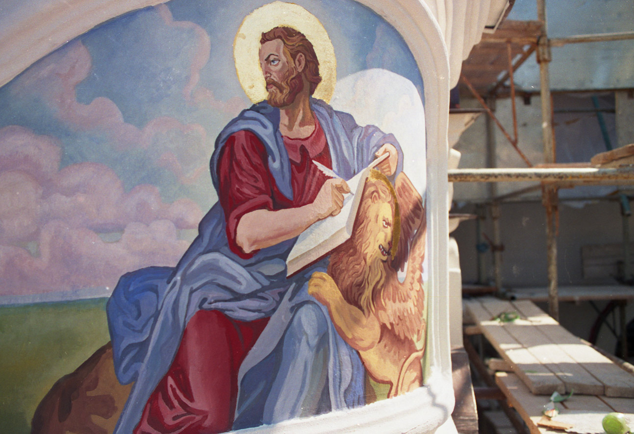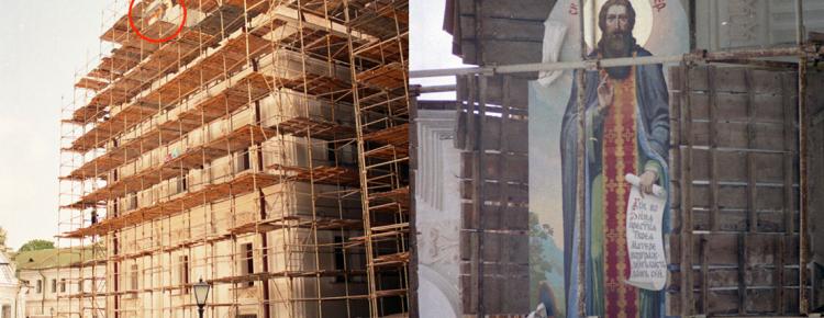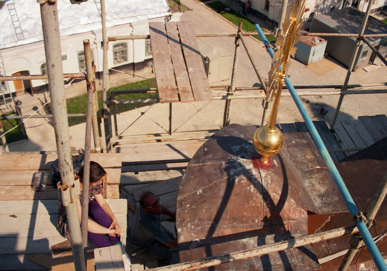 14-16. Реставратори працюють над зображенням євангеліста Іоанна (на північно-західному куті фронтону Іоанно-Богословського приділу)