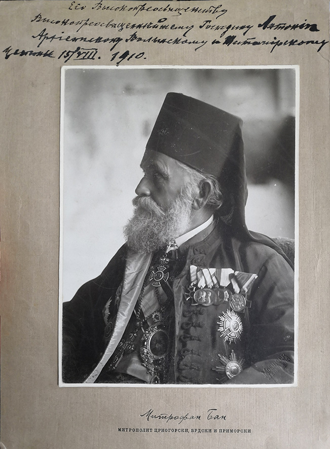 Серед наших фотодокументів є невелика, але досить цінна добірка фотографій із дарчими написами. Дві з них було подаровано владиці Антонію (Храповицькому, 1863–1936). Одна з них належала Митрофану Бану, митрополиту Чорногорському, Бердському і Приморському (1841–1920) – відомому натхненнику визвольної боротьби проти турецького панування на Балканах. На іншій зображено архімандрита Модеста. Виходячи з титулатури адресата можна припустити, що фотографію подаровано в 1914–1918 роках, коли Антоній обіймав Харківську кафедру. Невідомо, як ці світлини потрапили у збірку Заповідника. Можна припустити, що в лаврському архіві або у фототеці монастирської друкарні вони з’явилися під час перебування владики на Київській кафедрі. Звідти їх, разом із іншими, передав до музею колишній лаврський типограф, архімандрит Філадельф (Пшеничников).