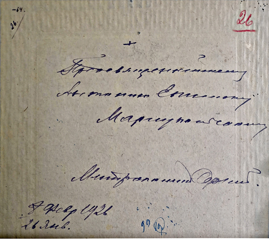 Свій фотопортрет митрополит Сергій (Страгородський, 1867–1944), заступник патріаршого місцеблюстителя і майбутній патріарх, подарував владиці Антонію (Панкеєву, 1892–1938), якого рукопоклали на єпископа Маріупольського, вікарія Катеринославської єпархії 24 вересня 1924 року. Владику розстріляли 1 червня 1938 року разом із архієпископом Курським Онуфрієм (Гагалюком) і кількома священиками.
