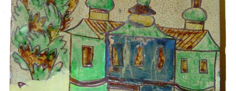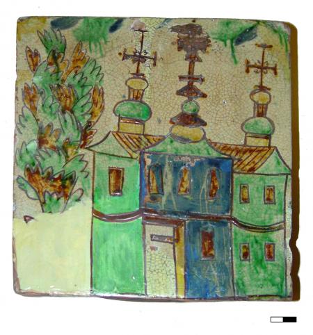 Особливо цікавими є дві знахідки: лицьова кахля із церквою та кутова із силуетом людини. Композиційно «архітектурна» кахля складається з двох зображень – трибанної церкви з притвором, розміщеної у правій частині виробу, і стилізованого дерева з лівого боку храму (іл. 1). Зображення виконані на світло-жовтому «мармурованому» тлі ангобами брунатного, синього і жовтого кольорів та зеленою поливою. Яруси храму підкреслені широкою брунатною смугою, верхня частина бань з’єднана з гранованими ліхтарями з круглими маківками. Бані увінчано хрестами зі штралами. У верхній частині композиції «фляндрівкою» з вільних мазків синього та зеленого кольорів нанесено стилізовані хмарки.