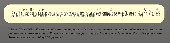 на території Національного Києво-Печерського історико-культурного заповідника зберігся найстаріший у Києві діючий до сьогодні дзвін? Його унікальність не тільки в тому, що він не був, як інші, вилучений, переплавлений, але й у тому, що має напис 1683 року про дарування дзвону, за обітницею Івана Стефановича Мазепи, на молитовну згадку про батьків до церкви Вознесіння Господнього. До того ж року належить перша відома нам згадка про матір тоді ще майбутнього гетьмана Мазепи як про ігуменю Вознесенської жіночої обителі, черницю Марію Магдалину.