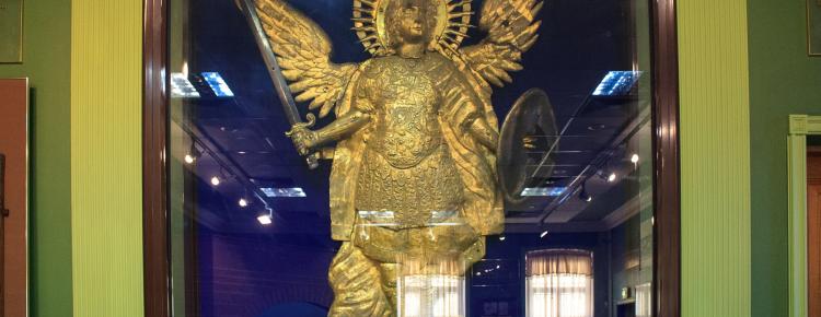 3. Мідний золочений барельєф архистратига Михаїла, що прикрашав верхню частину Михайлівського собору в Києві, в експозиції Музею історії Михайлівського Золотоверхого монастиря. 2010-ті рр. (https://zeft.in.ua/muzej-istoriyi-ta-dzvinitsya-mihajlivskogo-zolotoverhogo-monastirya-kiyiv/)