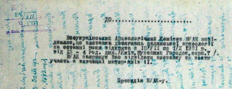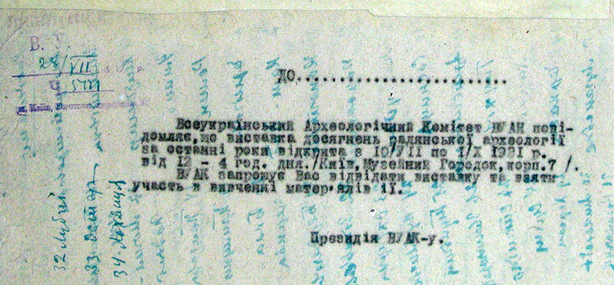 1. Чернетка запрошення на виставку досягнень радянської археології за останні роки. 1931 р. [НА ІА НАН України, ф. ВУАК, спр. 193, арк. 234а]