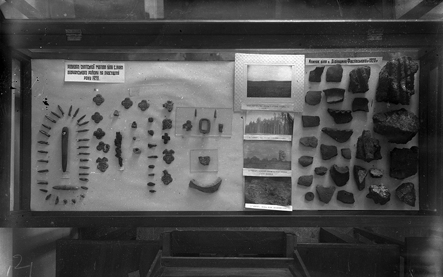 3. Вітрина з матеріалами з розкопок Сумського музею 1929 р. під керівництвом Миколи Макаренка неподалік с. Піщане (Сумська міськрада). «Виставка досягнень української археології за 10 років радянської влади». 1931 р. [КПЛ-Н-1442]