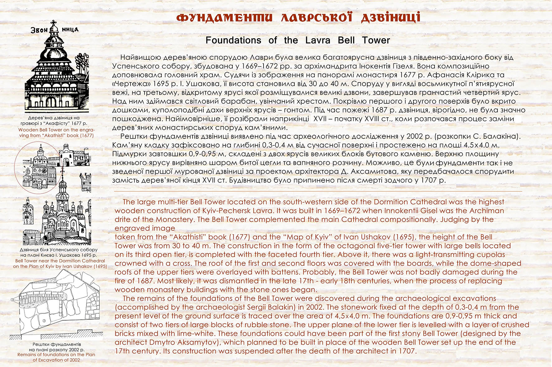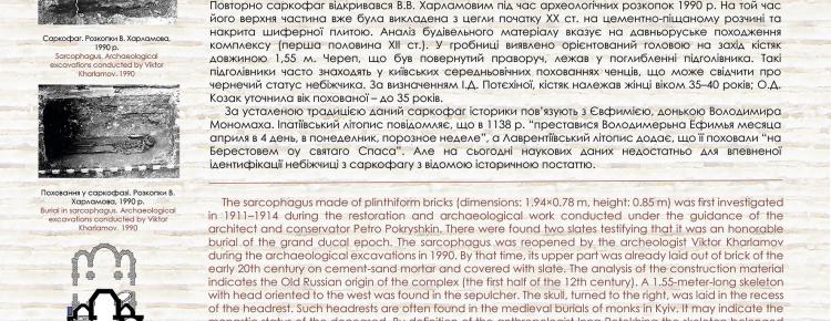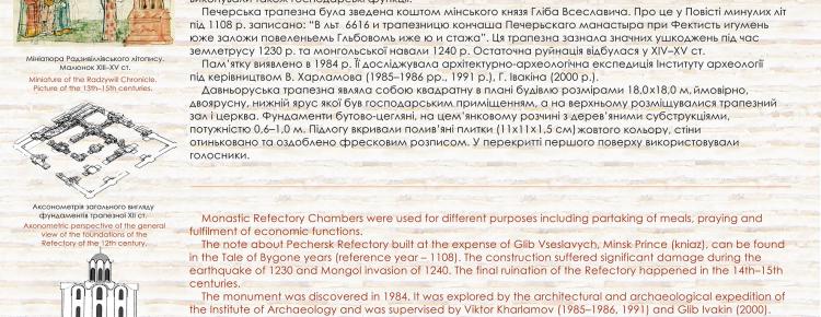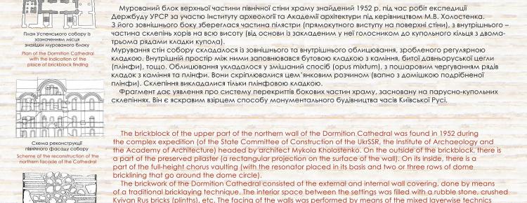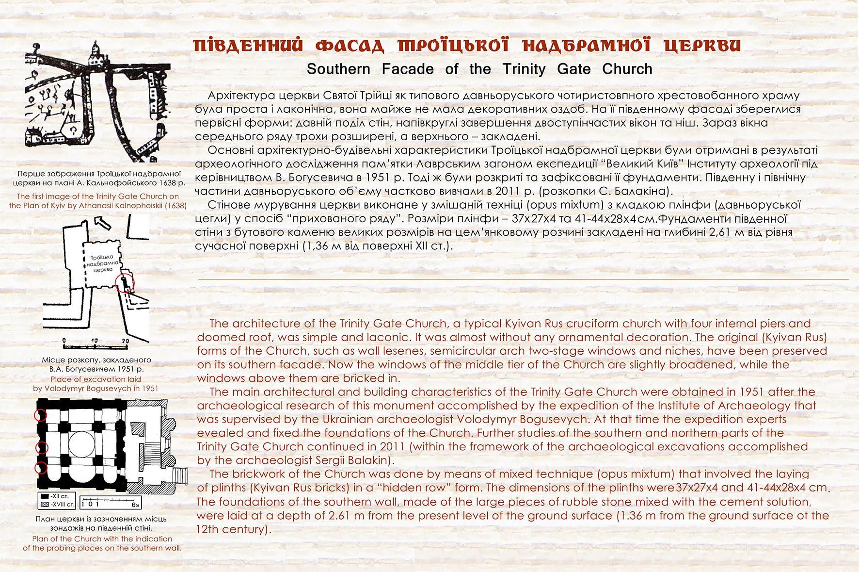 Протягом 2018–2019 рр. було реалізовано перший етап проєкту з маркування історичного простору нашого заповідника, в т.ч. – основних об’єктів архітектурно-археологічної спадщини (іл. 1). У його межах колектив науково-дослідного сектора археології розробив макети для шести археологічних туристично-інформаційних стендів (іл. 2-7). Характерною заливкою тла робочої площини для археологічних стендів стало контурне зображення будівельної кладки давньоруської цегли – плінфи. Найважливішим компонентом стенда є чітка та лаконічна двомовна текстова частина, яка подає основну інформацію щодо суті пам’ятки, персоналій та часу її дослідження, пояснює історичне значення та акцентує її значущість для сьогодення. Текст підготовлено з урахуванням основних засад музеології – упізнаваність, читабельність, зрозумілість. Між українською та англійською частинами для кращого зорового сприйняття розміщено розмежувальну лінію. Не менш важливими є ілюстрації, що доповнюють та пояснюють текстову частину. Якщо археологічний об’єкт не зберігся (частково або повністю), його візуалізації допомагає наведення сучасної реконструкції або відомих зображень із писемних джерел.