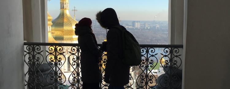 4. Молоді митці в процесі творчості. Панорамний погляд на лаврські споруди і річку Дніпро. Фото М. Ткаченко, 2017 р.