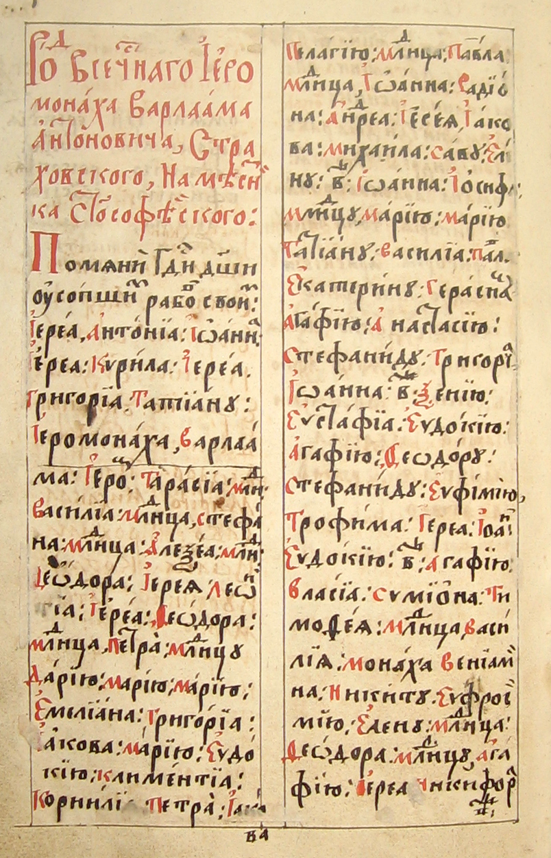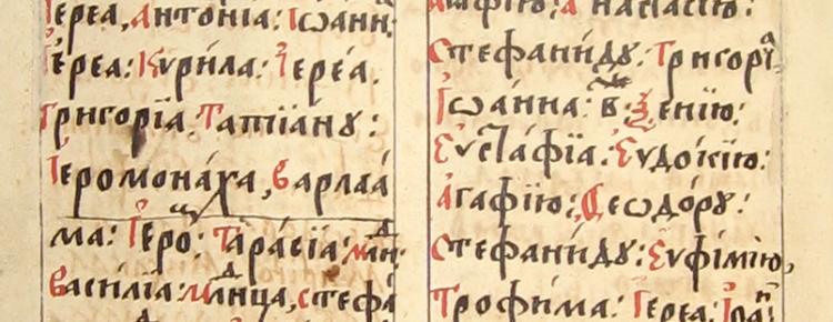 Підпис під ілюстраціями: Сторінки з Поменника Введенської церкви в Ближніх печерах Києво-Печерської лаври (друга половина XVII ст.)