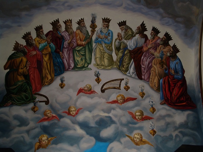 Іл. 5. Старці, що поклоняються Господу. Фрагмент композиції «Поклоніння старців і ангелів Агнцю». Розписи південного склепіння трансепта Успенського собору. 2010-ті рр.