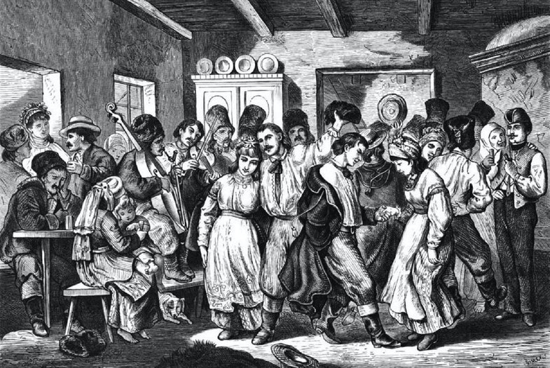 Іл. 1. Танці в корчмі біля міста Копичинці Чортківського повіту. Ілюстрація з книги Якова Головацького «Народні пісні Галицької і Угорської Русі»