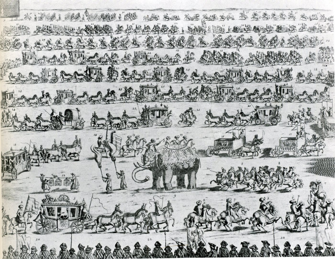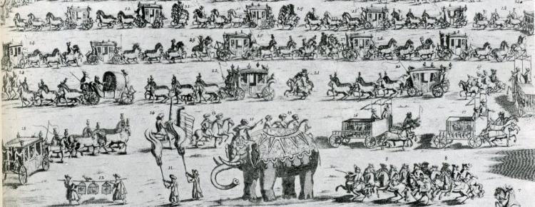 Сюжет є надзвичайно рідкісним. Композиція становить 20 карет із шістками коней, клітки з двома левами і гепардом, численні клітки з птахами та дрібними тваринами. Домінує у цій сцені величезний слон. Традиційною для барокової доби є репрезентація урочистої процесії, що прямує з однієї точки до іншої, компонуючись мальовничими звивами, та ритмічно розбивається на групи.