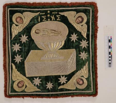 Покрівець – тканина богослужебного призначення для накриття Святих дарів, виготовлена у майстернях Києво-Вознесенського Флорівського монастиря − провідного осередку гаптування у Києві. Гаптування (з нім. «heften» − прикріплювати, зшивати) – це мистецтво вишивки, відоме в Україні з часів Київської Русі. Покрівець виконано з використанням дорогоцінних матеріалів: шовкового оксамиту, китайської камки, золотних і срібних ниток. У центрі вигаптовано престол із літургійною чашею, з чотирьох сторін – херувими. У чаші – Христос Немовля, у якому християнська традиція вбачає Агнця Божого, котрий жертвується за життя світу і спасіння.