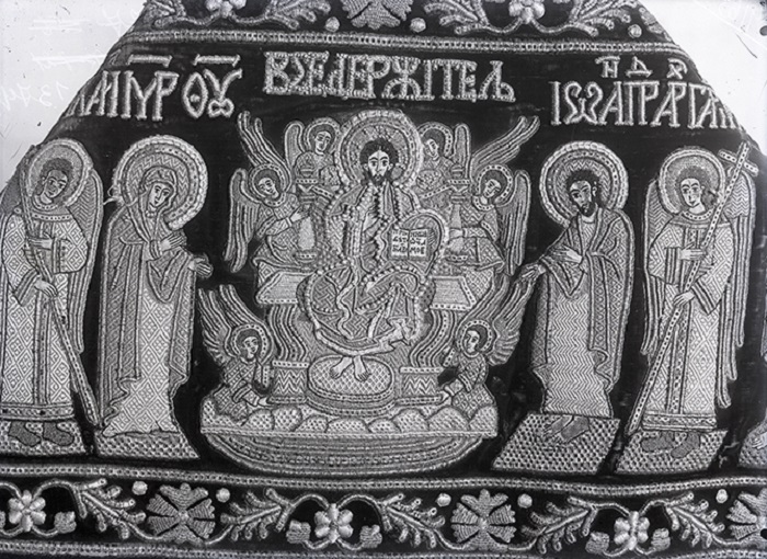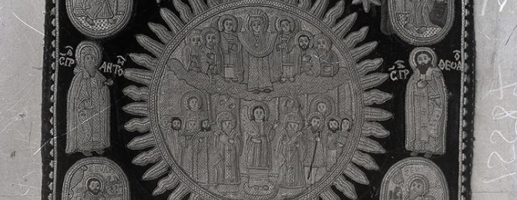 10. Фрагмент опліччя ризи з гаптованою композицією «Деісус із апостольським чином». Середина XVII ст. З колекції відділу шиття й тканини Всеукраїнського музейного городка [НКПІКЗ, КПЛ-Н-3144]