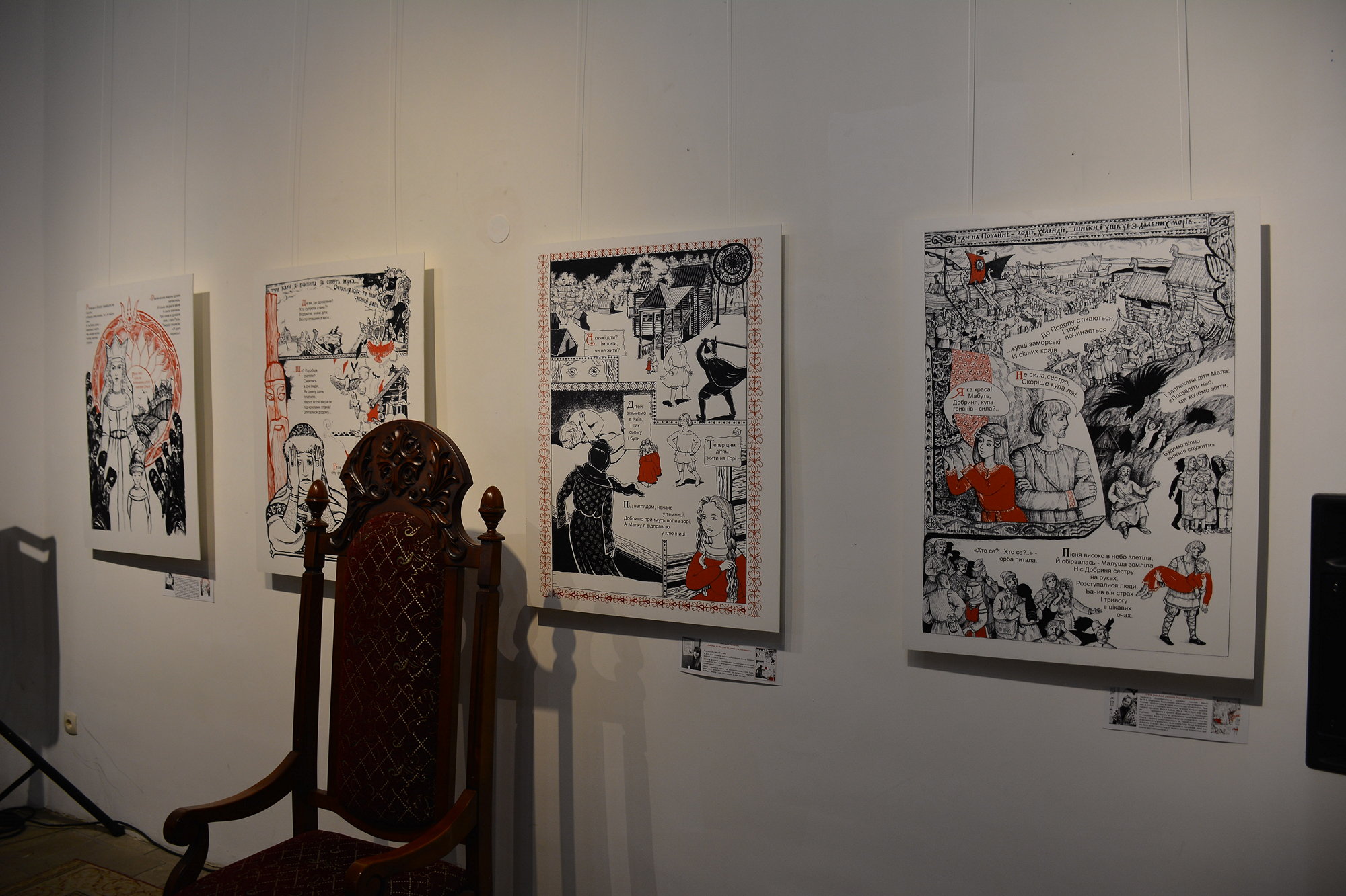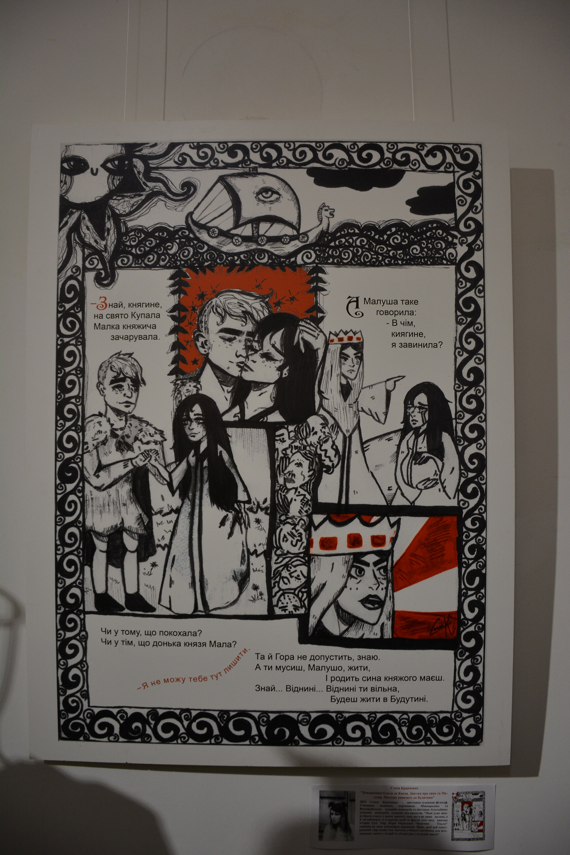 В експозиції представлені роботи у жанрі текстуально-візуального міксу історії та міфу, де зображено події в Україні ІХ–Х століть.