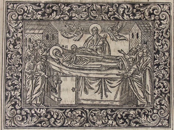 4. Києво-Печерська ікона «Успіння». Євангеліє видання Києво-Печерської Лаври. 1697 р. Гравюра зворотної сторони титулу. Дереворит (копія з мідьориту І. Щирського 1686 р.)