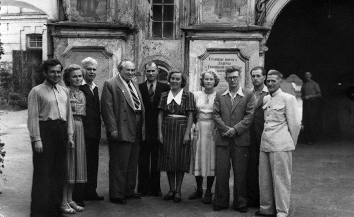 5. Делегація вчених біля Троїцької надбрамної церкви. Четвертий праворуч – академік О. Шмідт. Кінець 1940-х рр.