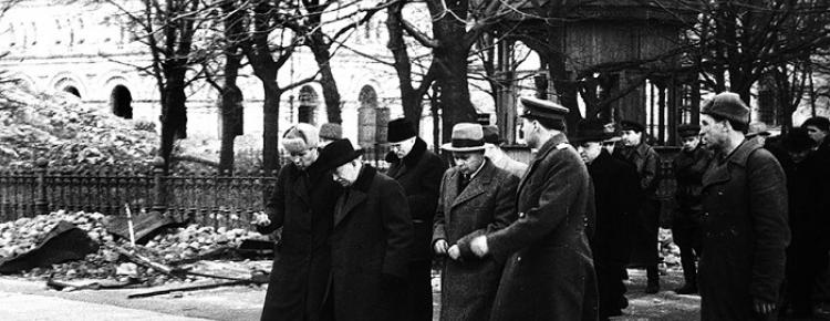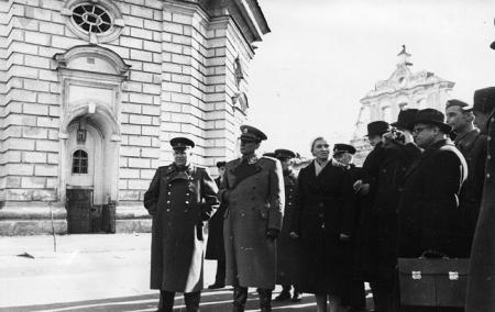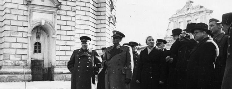 1. Югославська урядова делегація на чолі з маршалом Й. Броз Тіто (другий ліворуч) в супроводі першого секретаря ЦК КП(б)У М. Хрущова (перший ліворуч) в Києво-Печерській лаврі. Квітень 1945 р.