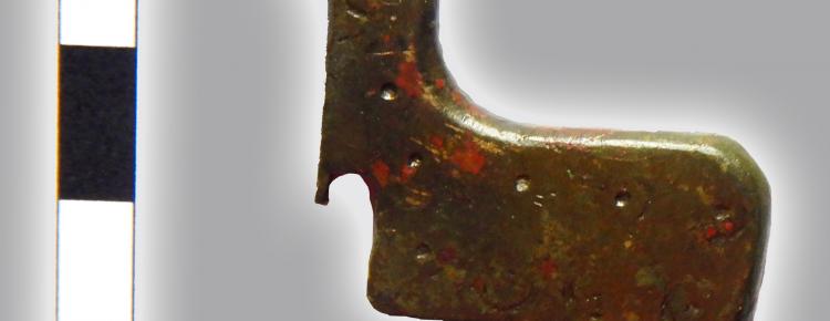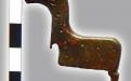 1. Стулка зооморфного замка у вигляді коника з території церкви Спаса на Берестові (інв. № 254). ХІІ–XІV ст. Кольоровий метал, розміри 4×4,3 см