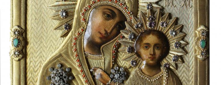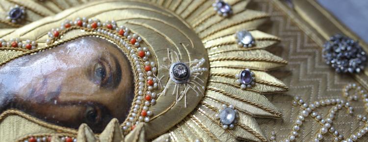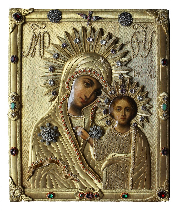 Важливим в роботі музейних працівників є здійснення комплексу заходів, спрямованих на збереження й всебічний аналіз артефактів із фондових колекцій. Найрезультативнішою в цьому контексті є тісна співпраця зберігачів, науковців та реставраторів. Саме завдяки їй ми можемо доторкнутися до раритетних пам’яток археології, історії та мистецтва з великої скарбниці національного культурного надбання. Сьогодні до вашої уваги представлено незвичайну ікону Богородиці Казанської. Образ було створено в Україні в кінці ХІХ – на початку ХХ ст. Особливістю ікони є техніка виконання та декорування. Її шати й тло суцільно гаптовані кількома видами золотних ниток, що прикріплено до поверхні виробу тонкими стібками шовку. Німби та одяг Богородиці і Немовляти Ісуса Христа вишукано прикрашено діамантами, аметистами і кольоровими скельцями в оправах і розетках. Краї вбрання Богоматері й Ісуса окреслено коралями і дрібними перлами. Обрамлення ікони має декоративні елементи, доповнені мініатюрним зображенням Св. Духа в образі голуба, що виконано з перлів і гранату. За художньою виразністю і багатством матеріалів гаптована ікона яскраво виділялася серед образів у традиційних карбованих шатах. Виготовляли подібні ікони переважно у жіночих монастирях, часто на замовлення приватних осіб.