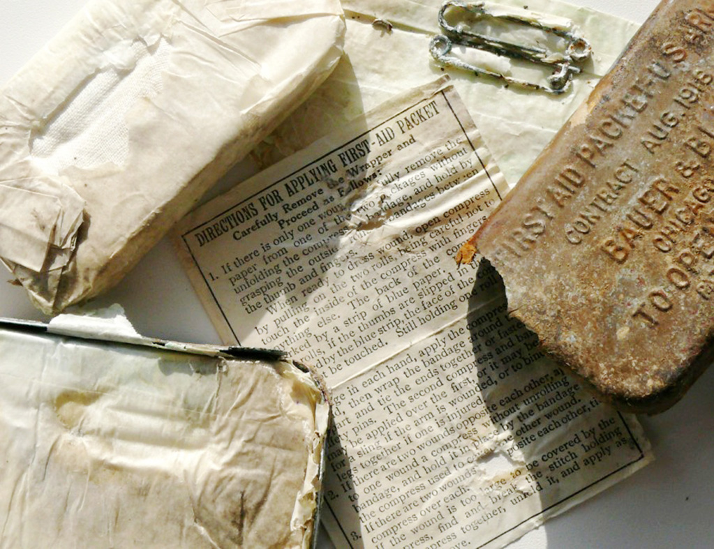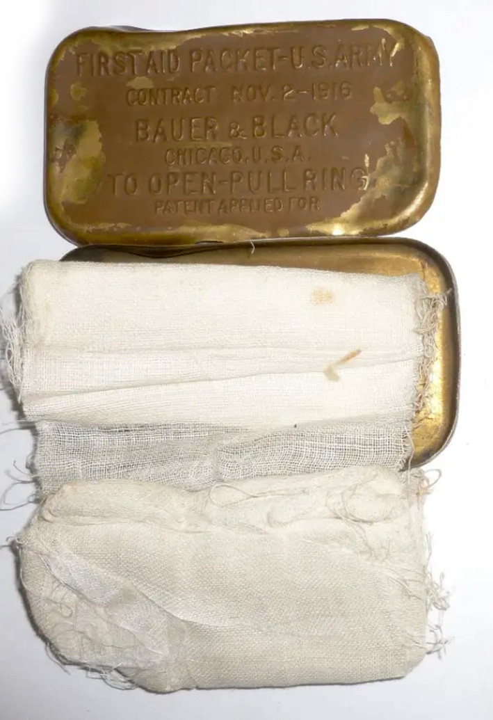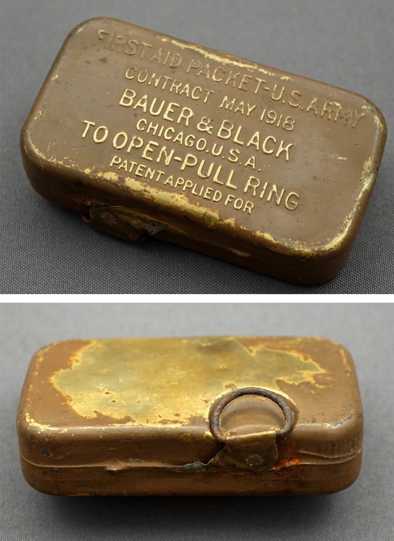 Такі медичні пакети використовували збройні сили США ще до початку Великої війни. Розроблені у 1904 р., вони постачалися до війська в герметичному латунному футлярі для захисту перев’язувальних матеріалів від газових атак і забезпечення їх стерильності. Їх носили запечатаними у маленькому латунному контейнері в солдатській сумці, прикріпленій до пістолета чи патронташа. Це була тогочасна польова аптечка, яка зазвичай складалася з двох окремих стерильних марлевих льняних бинтів-бандажів для перев’язки, запакованих у цупкий папір, двох булавок та інструкції з їх використання у разі отримання одного чи кількох поранень (іл. 3, 4). Протягом Першої світової вони продукувалися величезними партіями, а згодом масово поставлялися як для білогвардійської, так і для більшовицької армій. Тому такі знахідки на наших теренах не є надто рідкісними. Герметичний футляр, виготовлений з латуні або олова, складався із двох спаяних половинок і мав розміри 25×100×55-60 мм (Іл. 5). Цікаво, що подібні, але дещо модифіковані за складом аптечки використовували й під час Другої світової війни (іл. 6).