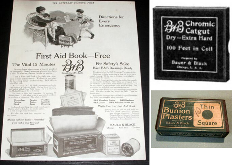 Компанію, що їх випускала, “Bauer & Black, Inc.”, зі штаб-квартирою в м. Чикаго, штат Іллінойс, заснували 1893 р. Луїс Бауер, його сини Олександр (Алек) і Густав, а також Стівен Блек. Компанія спеціалізувалася на виготовленні перев’язувальних матеріалів, пластирів, суспензоріїв, протекторів та іншого хірургічного приладдя (іл. 7). У 1901 р. відкрилася її перша нью-йоркська філія на Голд-стріт, а потім ще кілька – у центрі Нью-Йорка. Луїс Бауер (1840–1909) народився у Німеччині, 1866 р. іммігрував до США і спочатку заробляв роздрібною торгівлею у Міннесоті. Він фігурував у переписі населення США 1880 р.: жив у Чатфілд-Віллідж, штат Міннесота, з дружиною і 7-ма дітьми. Потім переїхав у Чикаго і почав випускати хірургічне приладдя. Один з його старших синів – Олександр (1862–1944) на момент смерті був головою правління компанії “Kendall”, яка у 1928 р. придбала “Bauer & Black”. 1976 р. остання перейшла до “Becton-Dickinson Company”, а з 2009 р. є підрозділом компанії “3M”. “Bauer & Black” і досі випускає медичну продукцію.