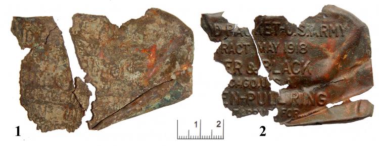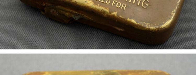 Іл. 1. Частина контейнера американського пакета першої медичної допомоги, знайдена на території церкви Спаса на Берестові (інв. № 44): до (1) і після (2) реставрації
