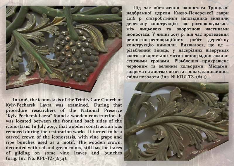 Раді представити вашій увазі черговий випуск рубрики «Експонат місяця». Ми презентуємо оригінальний музейний предмет з колекції Національного заповідника «Києво-Печерська лавра» – різьблений вінець зворотної сторони іконостаса Троїцької надбрамної церкви Києво-Печерської лаври. Вінець було виявлено науковими співробітниками Заповідника у 2016 році між лицьовою та зворотною частинами іконостаса.