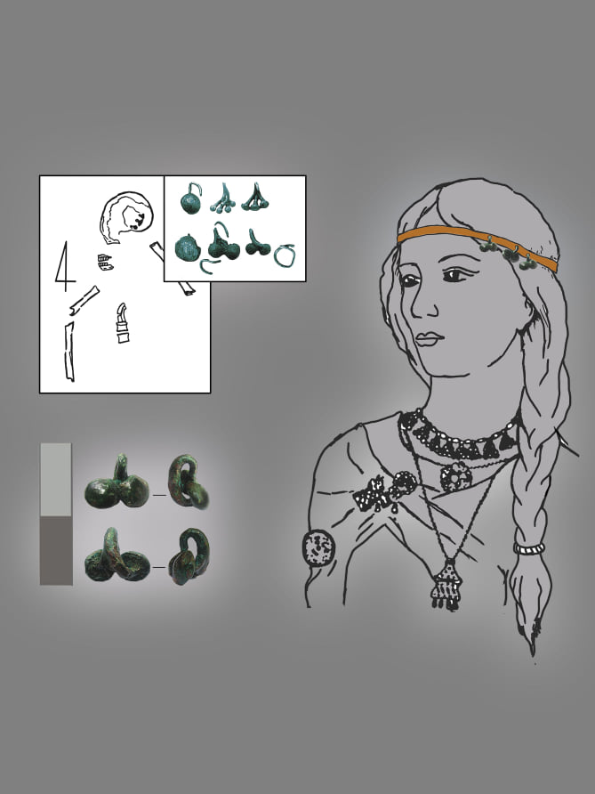 Серед знахідок виділяється доволі рідкісна бронзова підвіска з грибоподібними голівками. Прикраса має дві “гілочки” з круглими опуклими голівками та петельку для підвішування. Такі підвіски є типовими для підгірцівської групи милоградської культури і мають доволі широкий діапазон датування – VI–III ст. до н.е. Зустрічаються переважно в межах Київщини, серед матеріалів як поселенських (Підгірці, Велика Салтанівка, Вишеньки), так і поховальних пам’яток (с. Рудяки, Малополовецьке-3). Підвіску могли комбінувати з іншими прикрасами – в одному з випадків (Вишеньки) вона була закріплена на стрижні сережки з цвяхоподібною голівкою. Прикладом такого поєднання є інвентар з поховання № 181 могильника Малополовецький-3, де поруч із черепом було зафіксовано сім знахідок – цвяхоподібні сережки та підвіски з грибоподібними голівками, а також скроневе кільце. Вірогідно, така кількість прикрас є свідченням використання їх для оздоблення головного убору.