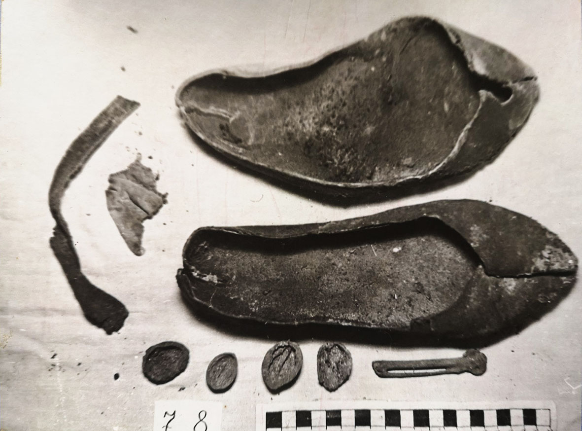 05. Наукова співробітниця заповідника Т. Кусок демонструє знайдений зразок чернечого взуття. Праворуч – Т. Можаровська
