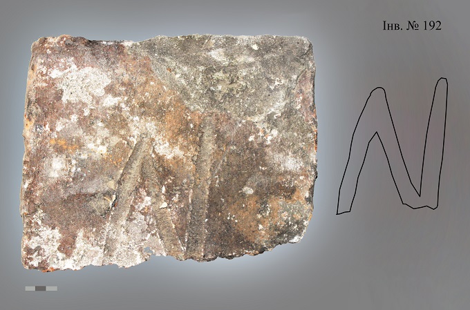 1. Фрагмент плінфи з торцевим знаком з Успенського собору, ХІ–ХІІ ст. Знак нагадує “тризуб” Рюриковичів. Можливо, це цифра системи грецького абеткового запису чисел “псі” – 700, яка може вказувати на партію чи порядковий номер цеглини.