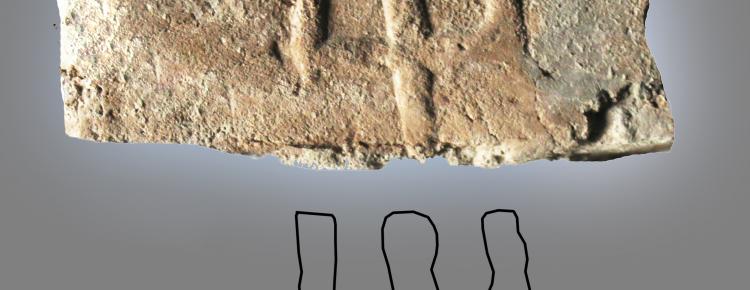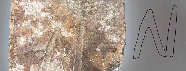 4. Фрагмент плінфи з клеймом з Успенського собору, XI–ХІI ст. Можливо, це цифра системи грецького абеткового запису чисел “ню” (N) – 50, або “дзета” (Z) – 7, яка може вказувати на партію чи порядковий номер цеглини.