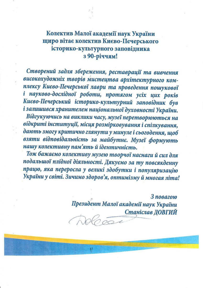 Вітання колективу Малої академії наук України з 90-річчям Національного Києво-Печерського історико-культурного заповідника
