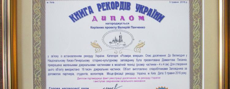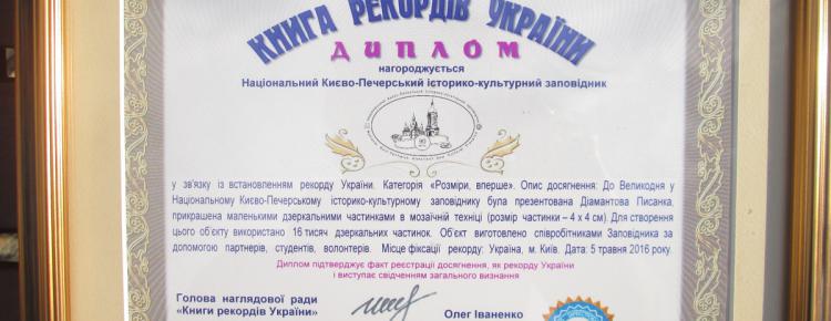 5 травня 2016 року в Національному Києво-Печерському історико-культурному заповіднику відбулася урочиста церемонія нагородження колективу Заповідника представником робочої групи Національного проекту «Книга рекордів України» за створення Діамантової Писанки.