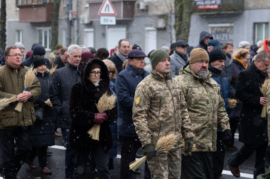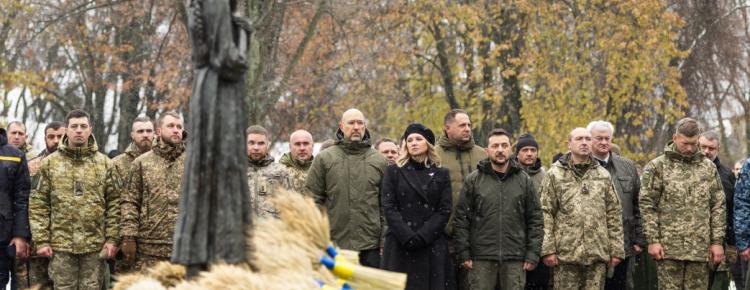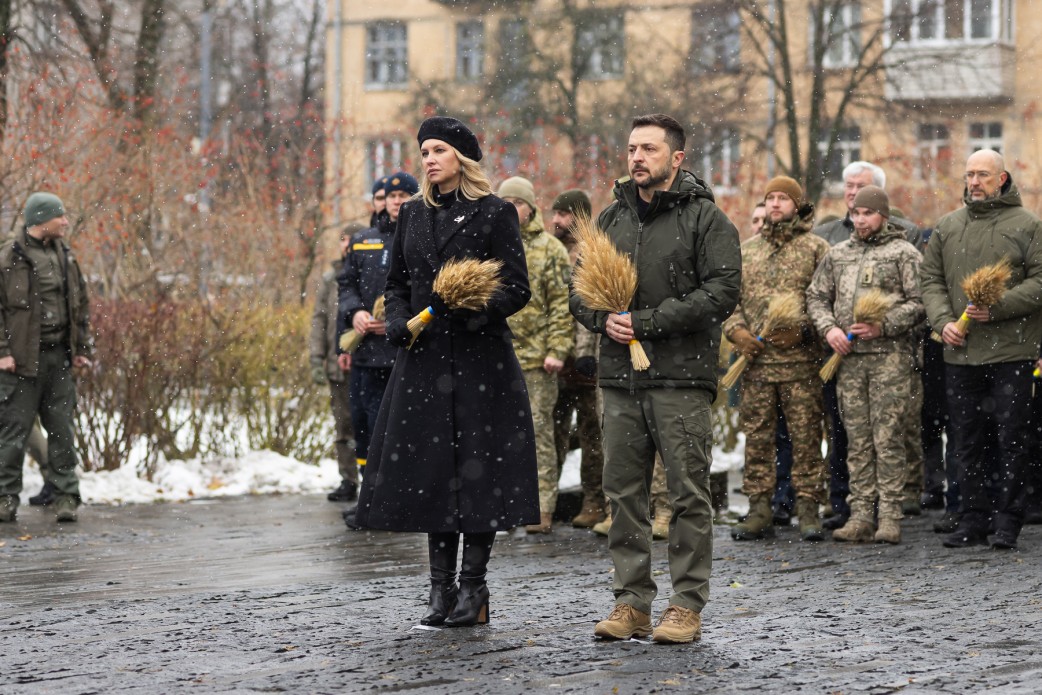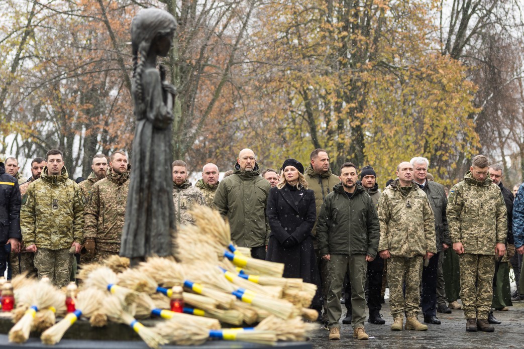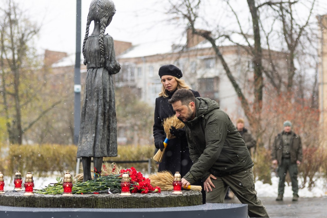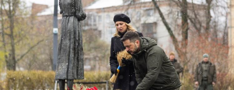 З Успенського собору процесія рушила ходою до Національного музею Голодомору-геноциду. Володимир та Олена Зеленські поклали колоскові композиції до монумента “Гірка пам’ять дитинства” та віддали шану жертвам Голодомору.