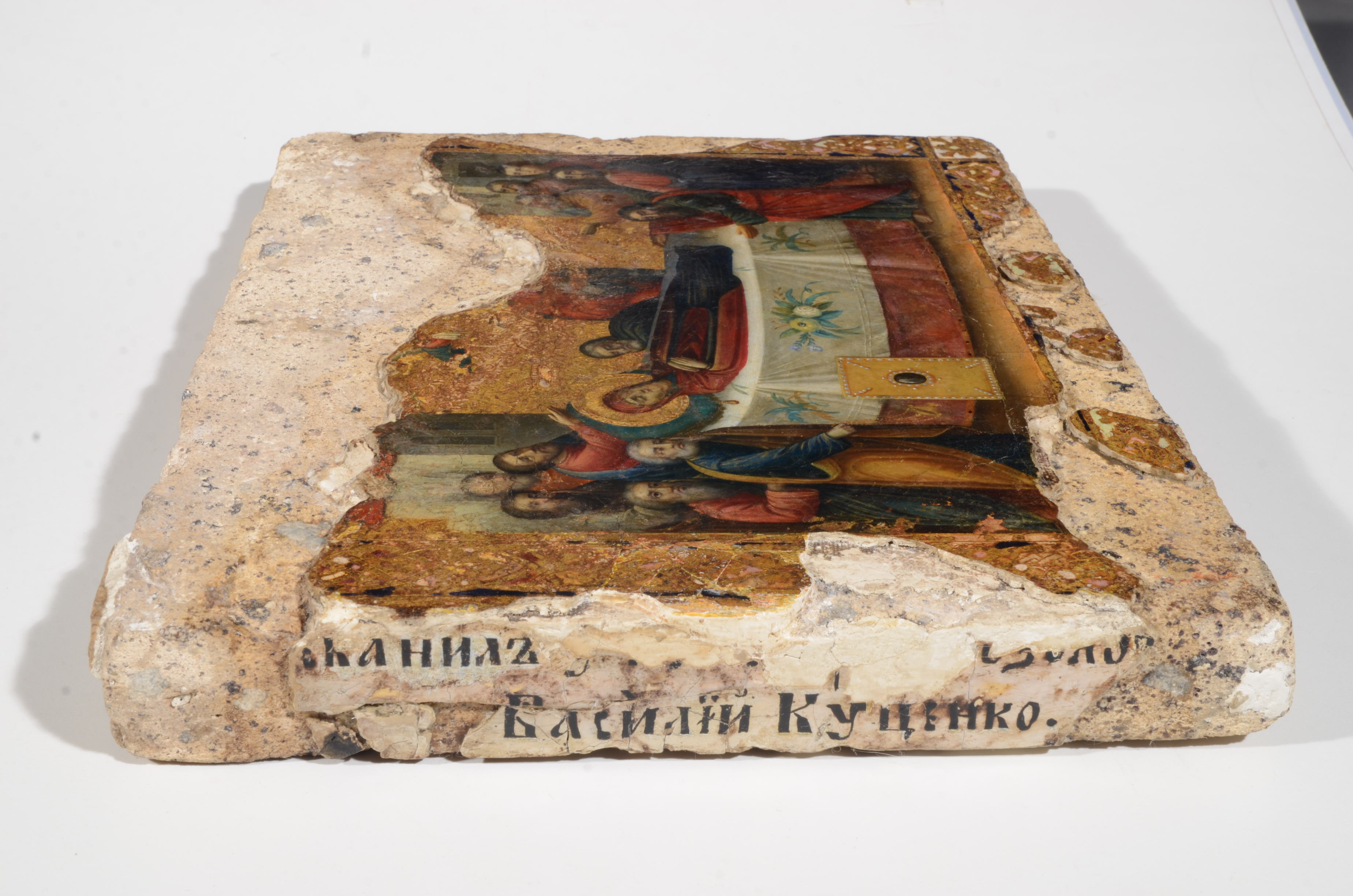 The precious icon was found in 1962 during the excavations organized in the place of the ruins of the Dormition Cathedral. It was in an awful and almost destroyed state.