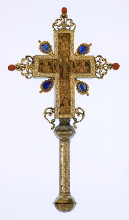 The Cross is the real example of the ornamental art of the 17th century. Its gilded silver mounting is decorated with the colored glass and corals fixed on its open-work tops. The handle has the donative engraving. On the right side of the Cross there is the traditional carved image of “Crucifixion”, on its reverse side - the image of the Mother of God with prayerfully folded hands.
