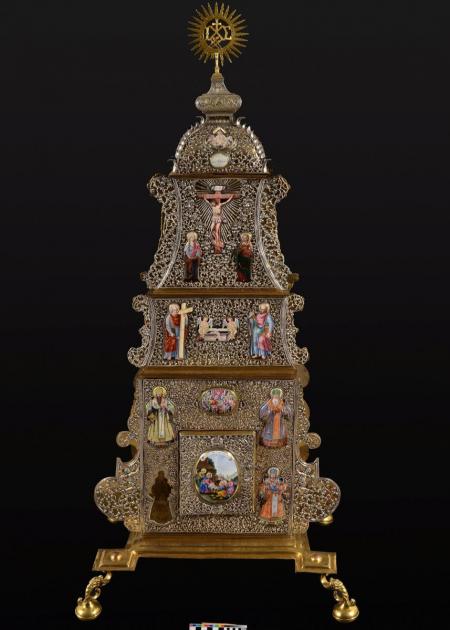November 19, 2019 is the opening date for the exhibition “Revived Ukrainian Treasures” that consists of the rare museum items rescued from the ruins of the Dormition Cathedral. Today they belong to the Fund collection of the National Kyiv-Pechersk Historical and Cultural Preserve. One of the valuable displays to be presented at the exhibition after its complex restoration is unique tabernacle, which was donated to the Dormition Cathedral in 1726.