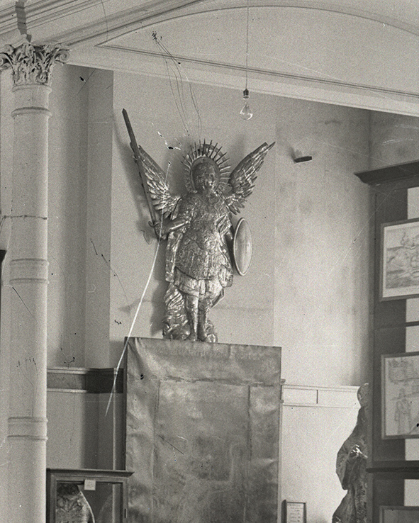 “A sword and shield, copper gilded and hammered figure of Archangel Michael was passed to the funds of the museum institution from St. Michael’s Monastery. It was transferred under the Act of August 5, 1934 along with gilded copper crosses of the central dome and Catherine’s southern aisle of the Cathedral. Soon a copper embossed gilded bas-relief of Archangel Michael, made in the middle of the 18th century, was included into the exhibition “Religion in the Service of Feudal Exploiters” exposed in the Annunciation Church of Kyiv-Pechersk Lavra. Probably due to the events of the Second World War, the work of the Kyiv School of Baroque Metal Sculpture appeared in the courtyard of the Institute of Fine Arts and stayed there until 1956. There it was discovered by the Ukrainian art historian Pavlo Zholtovsky who transferred the work of art to the Lviv Museum of Ethnography and Crafts (nowadays subordinated to the Institute of Ethnology of the National Academy of Sciences of Ukraine). In 1999, the figure of Archangel Michael was returned to Kyiv and passed to the Museum of History of St. Michael’s Golden-Domed Monastery, where the bas-relief is still on display.