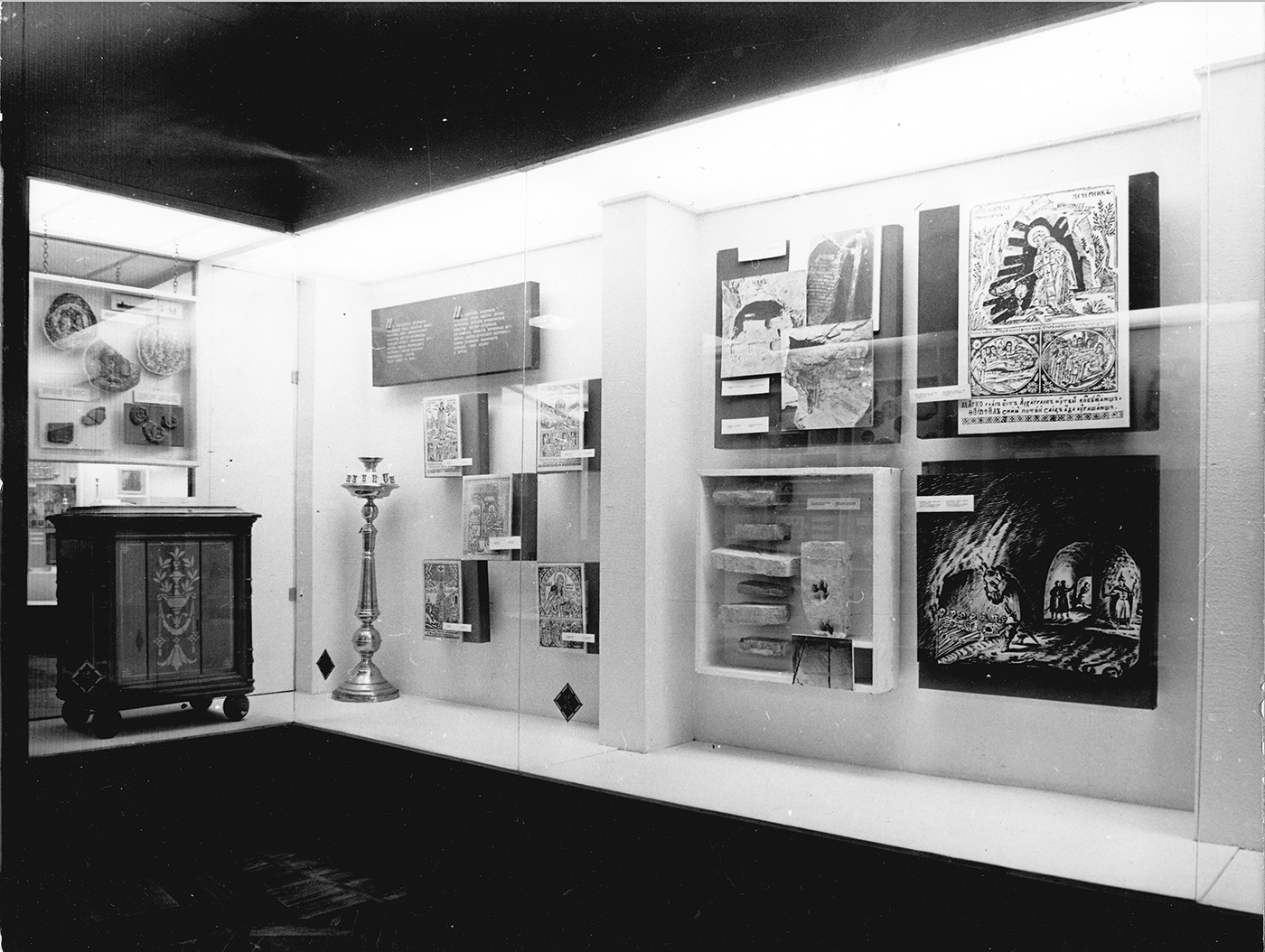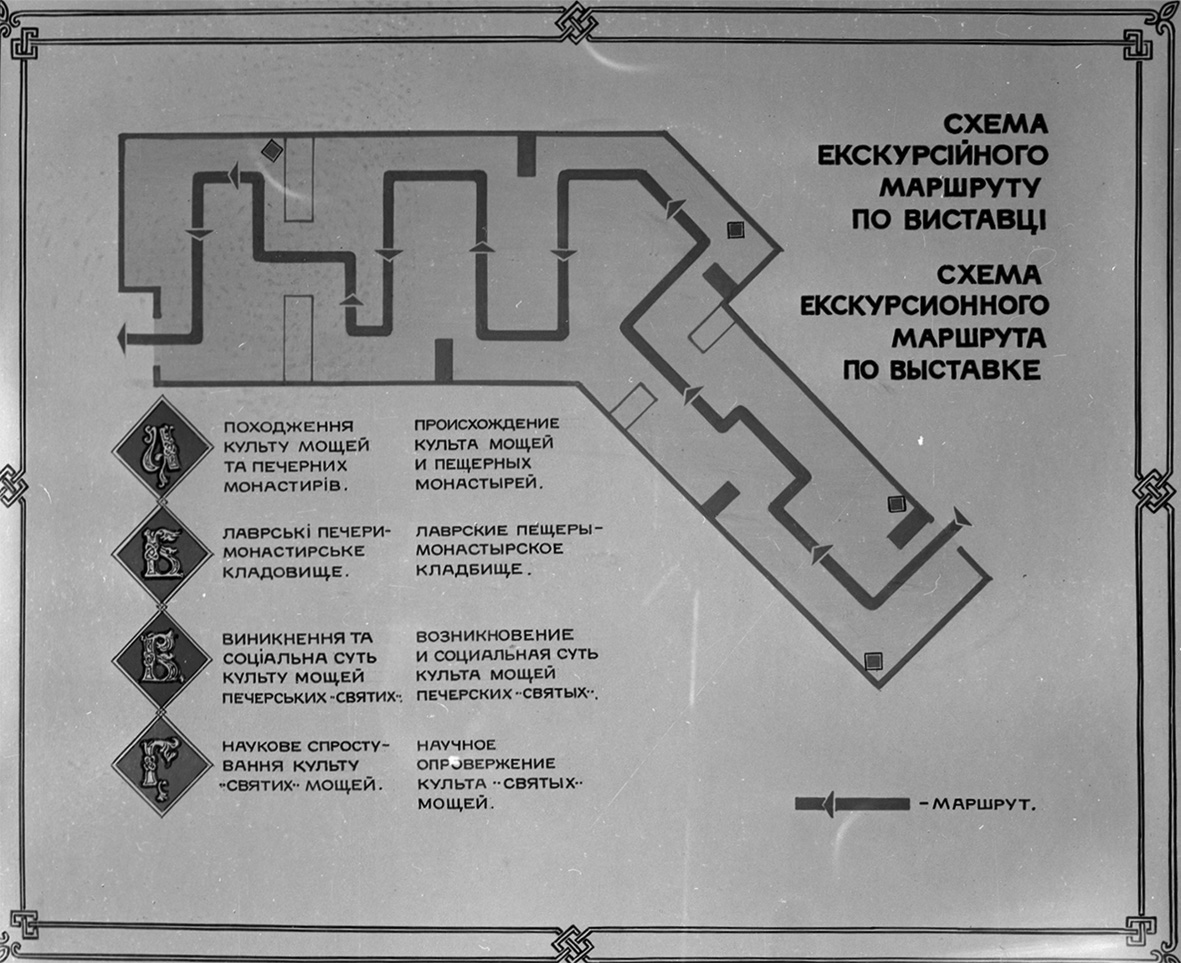 Виставку було тематично поділено на чотири основні розділи: «Походження культу мощей та печерних монастирів», «Лаврські печери – монастирське кладовище», «Виникнення та соціальна суть культу печерських святих», «Наукове спростування культу нетлінних мощей». Попри те, що її будували «з позицій наукового атеїзму», її експонати надавали можливість відвідувачам у загальних рисах ознайомитися з історією найцікавіших давньоруських пам’яток. Починалася експозиція матеріалами, що розкривали поступовий розвиток культу померлих від найдавніших часів. Його ілюструвала діорама «Поховання неандертальця у гроті Тешик-Таш» (фото 2). Було представлено фотографії стародавніх печерних монастирів. Зміни конфігурації Ближніх і Дальніх печер можна було прослідкувати за планами XVII–ХХ ст.