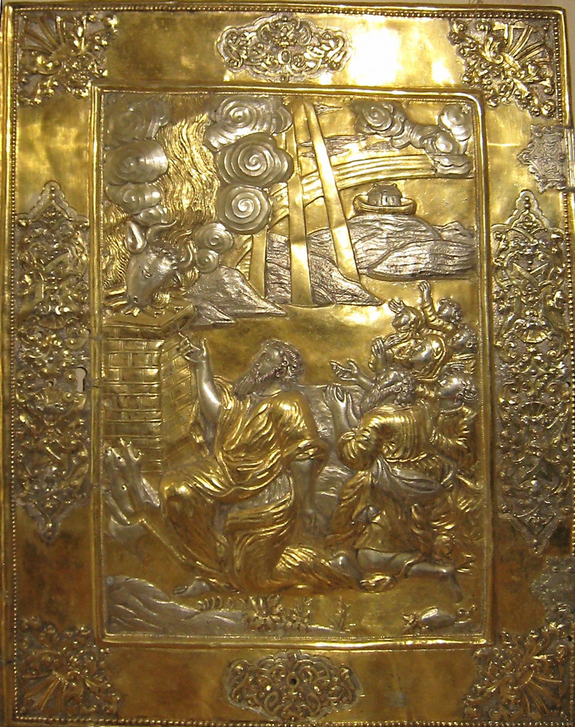 The decorations of each side of the altar consisted of several parts. On the east side, there were four plates, two of which covered the door leaves that closed a niche in the stone wall of the altar. On the right leaf, there was a plate with the composition "Noah's Sacrifice", on the left - "Abraham's Sacrifice". It should be noted that these plots are rare ones in the sacred goldsmithing works, especially the composition "Noah's Sacrifice after leaving the ark". The engravings of the Piscator’s Bible (1650) became the iconographic source for them.