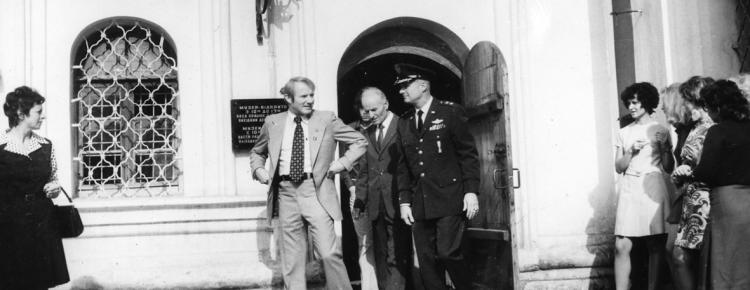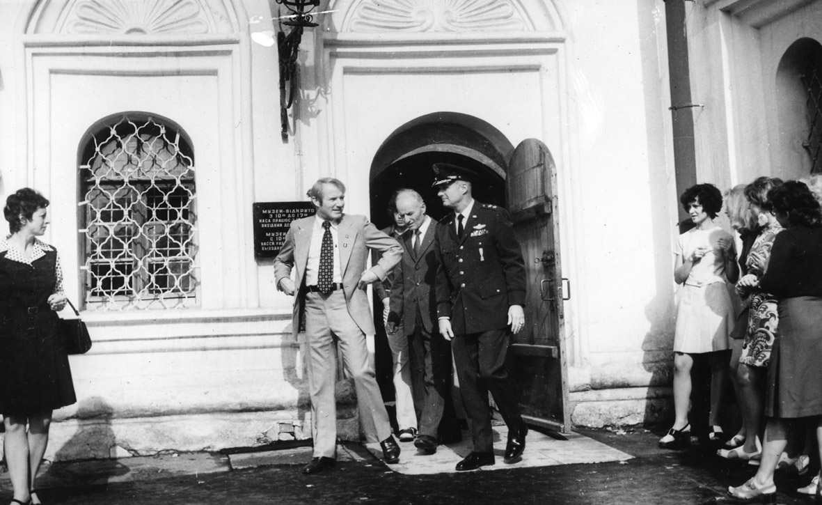 09. Астронавти США Венс Бранд (ліворуч) та Томас Стаффорд (праворуч, у формі). Між ними – заступник директора заповідника М. З. Петренко