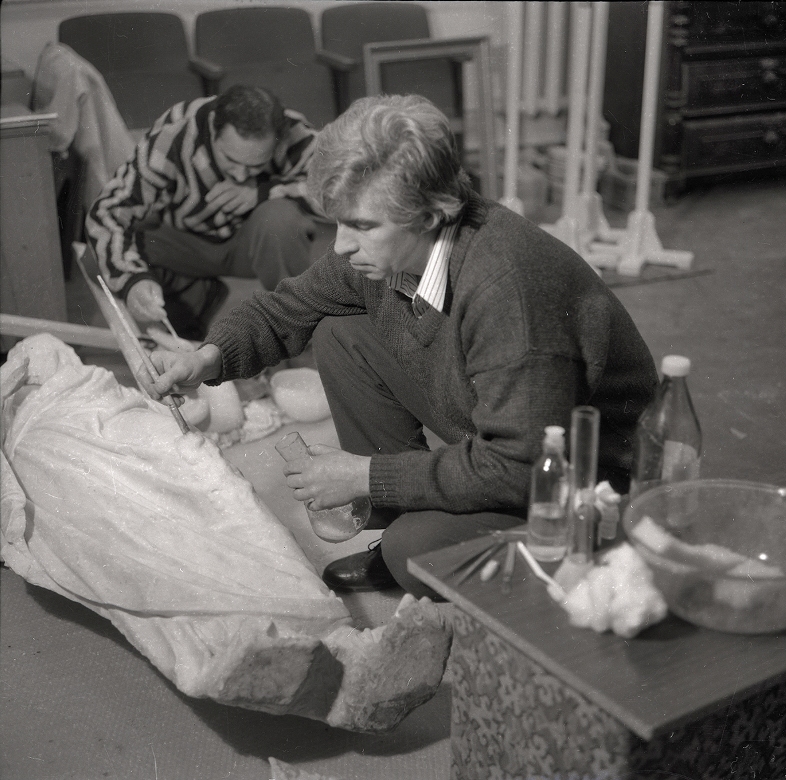 10. Oleksandr Zagrebelny and Vasyl Mikropulo during the restoration of the “Faith” sculpture of the monument to Prince Constantine Ypsilanti. 1996 (inv. № KPL-N-8115)