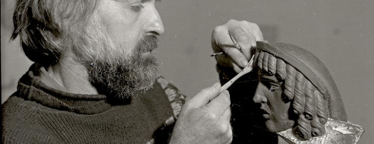 18. Sculptor S. Shvets models the acroterion-mask from the sarcophagus of the monument to Prince Costiantyn Ypsilantis, 1996 (inv. № KPL-N-8113)