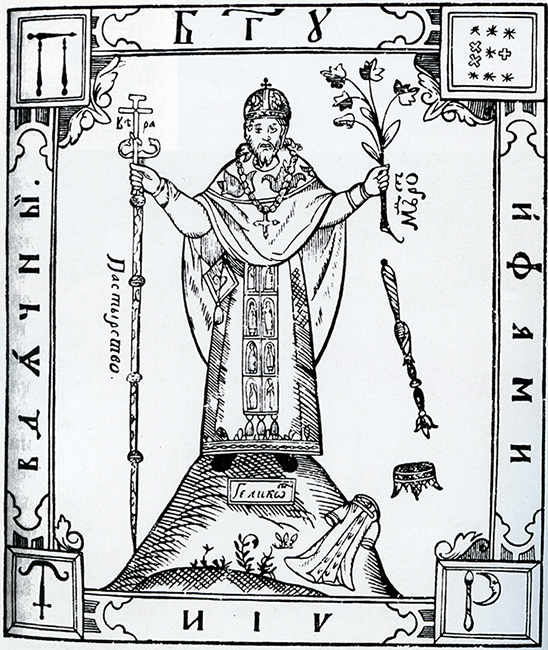1. Archimandrite Petro Mohyla standing on Mount Helicon with the signs of Pastoral Care, Faith and Wisdom in his hands. Illustration for the panegyric “Eucharist or gratitude…to Petro Mohyla…”, 1632.