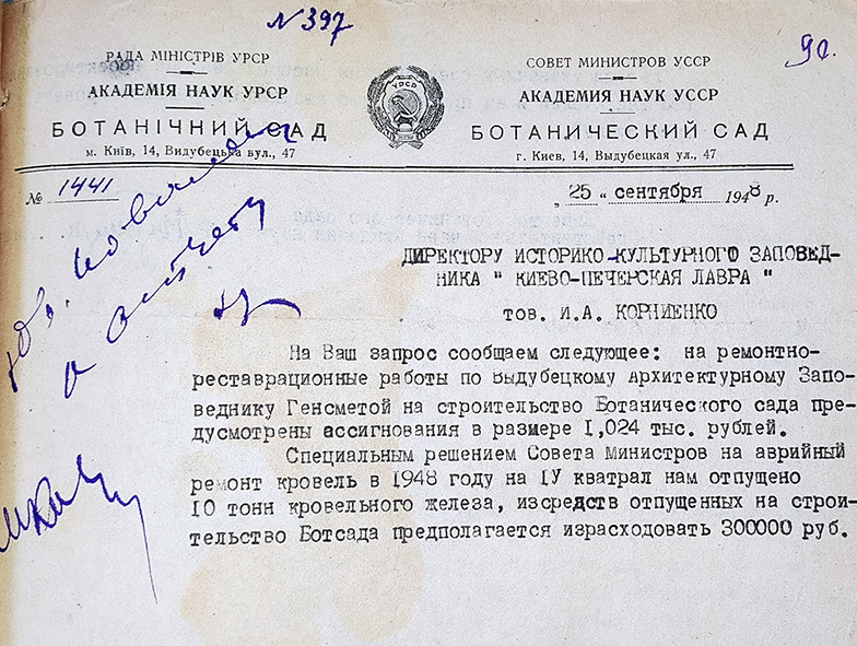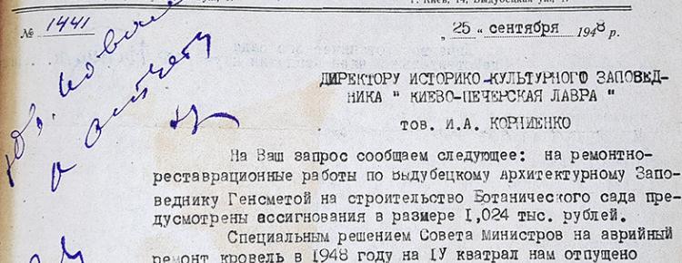 Іл. 2. Лист-відповідь щодо фінансування ремонтних робіт на теренах Видубицького монастиря, надісланий адміністрацією Ботанічного саду АН УРСР 25 вересня 1948 р. директорові історико-культурного заповідника «Києво-Печерська лавра» (З колекції НЗКПЛ)