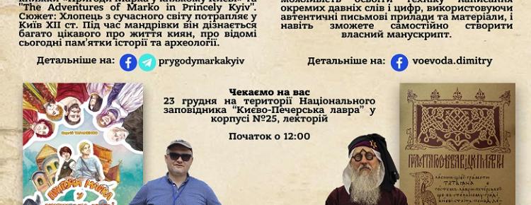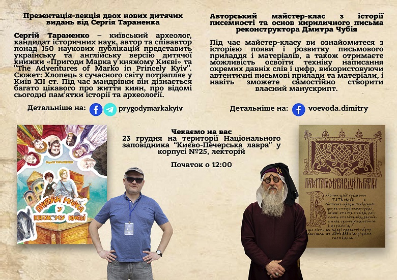 О 12-00 в цьому ж приміщенні розпочнеться презентація-лекція книги к.і.н., завідувача науково-дослідного сектору археології Сергія Тараненка “Пригоди Марка у княжому Києві”, після чого пройде авторський майстер-клас реконструктора Дмитра Чубія з історії писемності та основ кириличного письма.