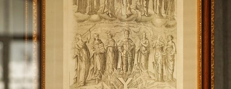 Вище у фокусі уваги – успішний воєначальник в лицарських обладунках, котрого оточують алегоричні постаті покровительок мистецтв і наук. Підсилює бароковий символізм гравюри містична сила сімки, адже кожний композиційний ряд складають сім образів.